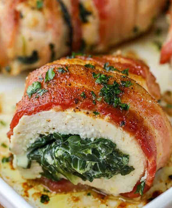 4. Divide the spinach mixture over each breast and top with one slice of Swiss cheese. Close chicken around spinach and cheese. Wrap each breast with two slices of bacon and secure with toothpicks. Season with chicken seasoning, salt & pepper.